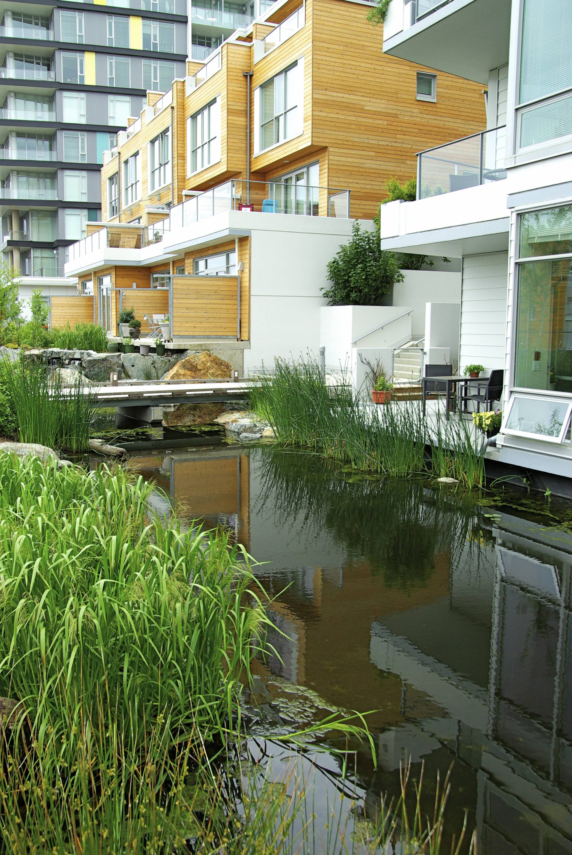 This new community is a major achievement in community planning, pedestrian-oriented design, waste and rainwater management, environmental regeneration, and energy efficiency. Our team helped achieve outstanding environmental targets while developing a truly unique and richly-layered setting for residents. Many innovative approaches to sustainability and green infrastructure came to life in this project, some of which had never been seen before in a dense, urban North American environment. We helped create a blackwater treatment system, a biomass clean energy system, rainwater collection, and environmental biodiversity. All the systems had to work together and be integrated into the development seamlessly. A perfect example of this integration is the black water system, which added to the stormwater collection and created a pond system for aquatic and terrestrial life while creating a beautiful landscape for residents and visitors.